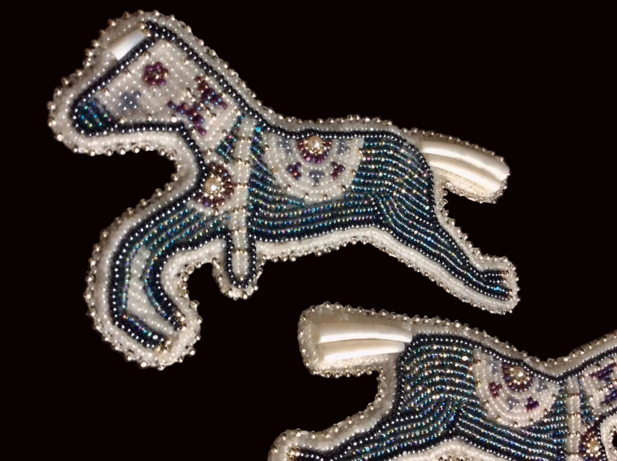About the artist: Sue Cliff is an enrolled member of the Turtle Mountain Band of Chippewa located in North Dakota. Her Metis lineage is interwoven with Chippewa, Cree, Nakoda, and French. It is the artist's intention to create each dentalium jewelry item to highlight aspects of the symbols, colors, and art form(s) utilized by her Indigenous ancestors. Sue Cliff uses dentalium, abalone, freshwater pearl, seed beads and other art components to create theme-based jewelry of the buffalo, horse, thunderbird, turtle, dragonfly, and other symbols.